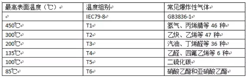 這是與氣體點(diǎn)燃溫度有關(guān)的電氣設(shè)備(假定環(huán)境溫度為40℃時)的最高表面溫度,點(diǎn)燃能量與點(diǎn)燃溫度無關(guān)。在標(biāo)準(zhǔn)BS5345第一部分中列出了所有可燃性氣體和其組別。